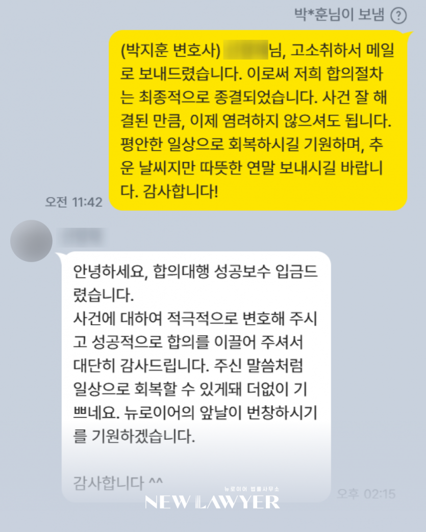 "적극적으로 변호해주시고 성공적으로 합의를 이끌어주셔서 대단히 감사드립니다."