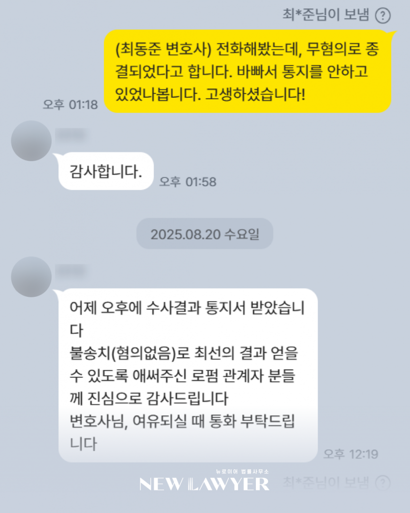 "불송치로 최선의 결과를 얻을 수 있도록 애써주신 로펌 관계자 분들께 진심으로 감사드립니다."